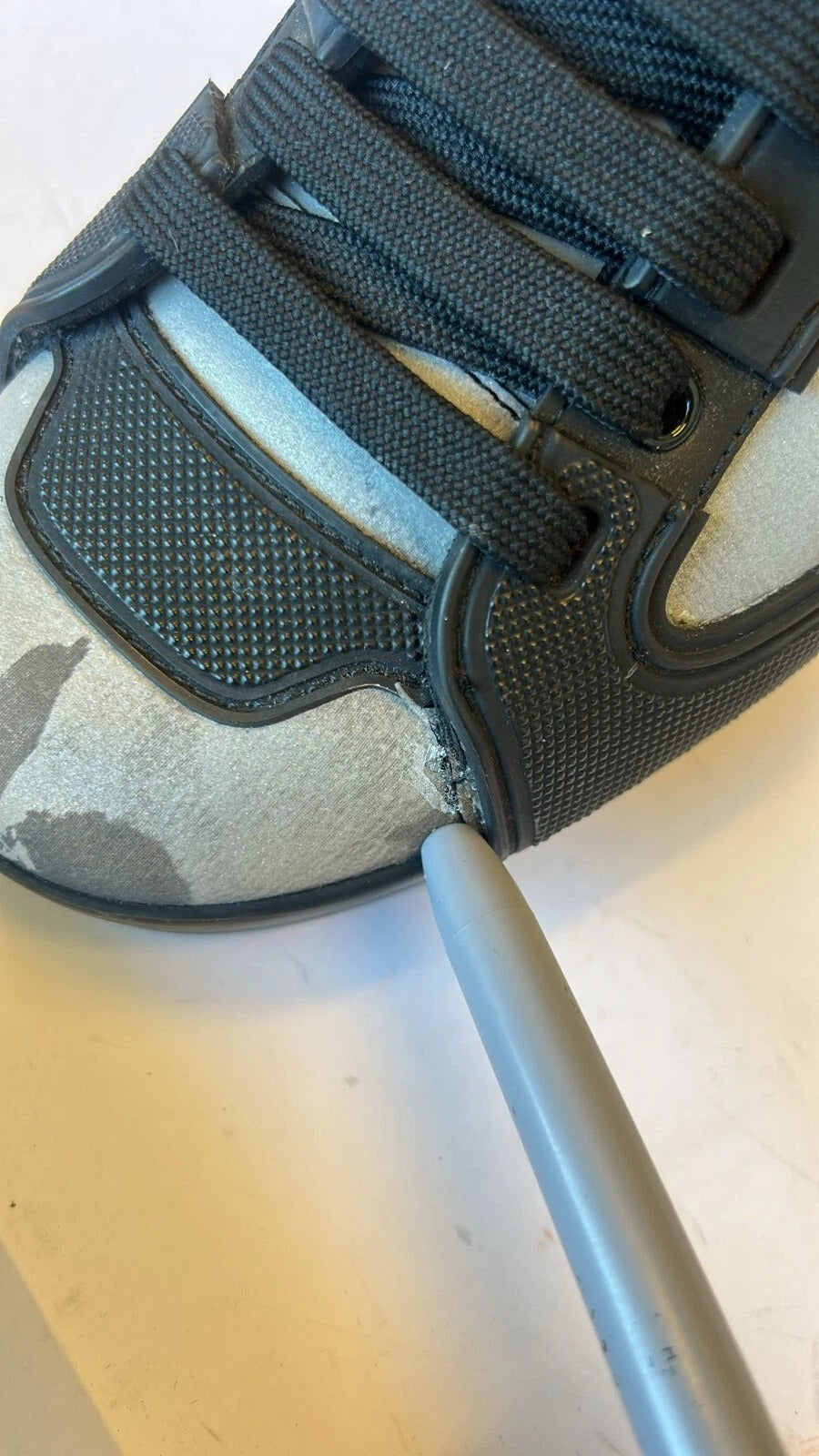 This item has been used as a showroom display piece. There is a small rip on the right shoe and some tiny scratches (see pictures for details). This is the reason for the low selling price and a great opportunity to make a bargain.