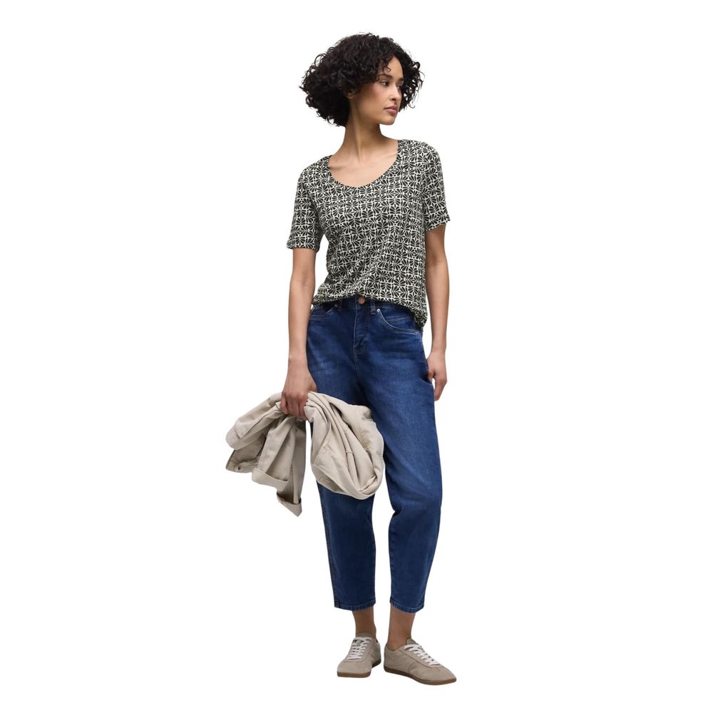 The Street One Style New Gerda women’s t-shirt, model 324798, combines comfort and style in a versatile and on-trend garment. Crafted from a premium blend of 50% Modal and 50% Modacrylic, it feels soft and light against the skin, making it perfect for spring and summer. The short sleeves and all-over geometric pattern add a modern and dynamic touch to your everyday outfits. Its regular fit cut and round neckline enhance femininity without compromising practicality, making this t-shirt suitable for both casual and sophisticated looks. An easy-to-match essential for any contemporary wardrobe.